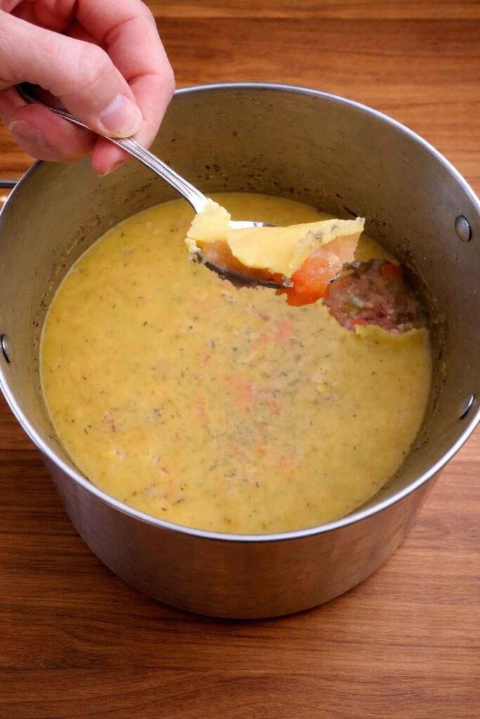Ham hocks are the part of the pig’s leg that connects the bones, and they are very rich in connective tissue that is full of collagen. When this connective tissue is simmered on low heat for a few hours, it breaks down into gelatin. This is what gives the soup its rich, silky body and the jelly-like texture it gets when it cools down. A ham bone by itself, which is mostly bone and meat, can’t add as much gelatin without extra hocks.