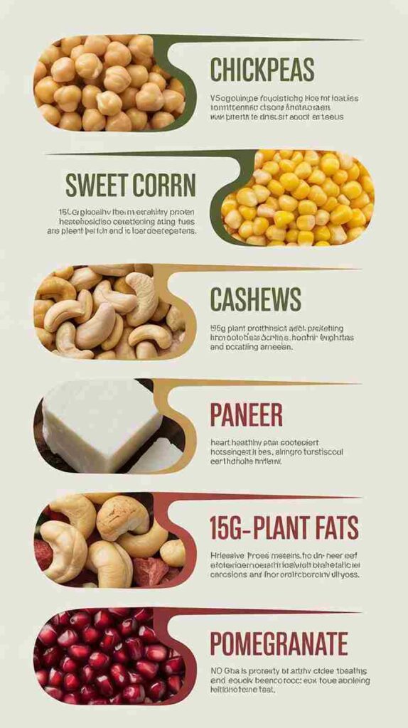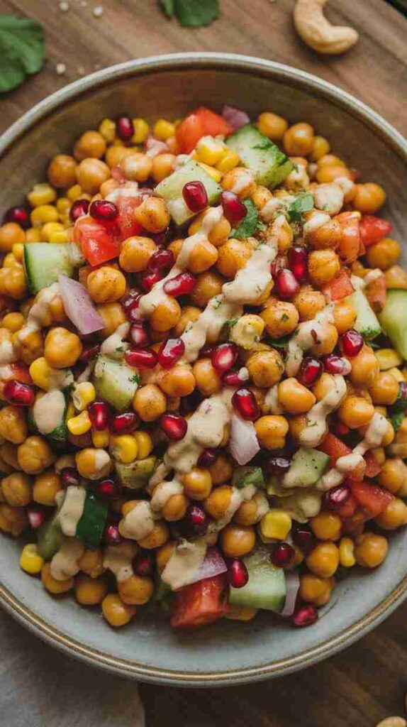 What makes this salad particularly special from a nutritional standpoint is its balance. Chickpeas are one of the most protein-rich plant foods available, providing substantial fiber alongside their protein content — a combination that keeps you full for hours and supports healthy digestion. Sweet corn adds natural sweetness and a dose of B vitamins and antioxidants. Cucumber and tomato bring hydration and lightness, keeping the overall dish feeling fresh and clean despite the richness of the dressing. Pomegranate seeds deliver a meaningful hit of vitamin C and powerful antioxidants. And cashews and paneer together contribute healthy fats and additional protein that make this salad genuinely filling as a standalone meal.