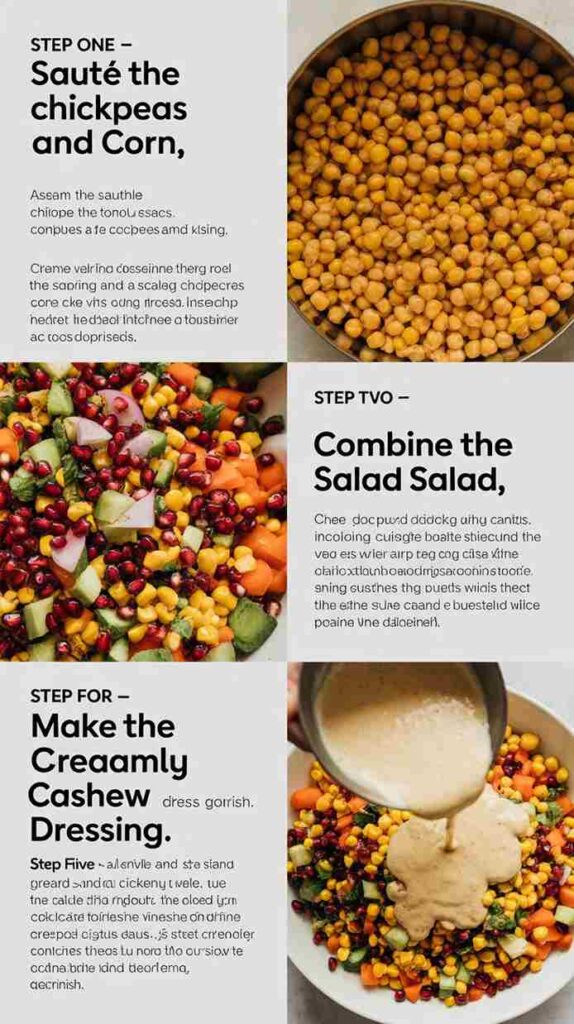 Pomegranate seeds function as a flavor bridge between the spiced, savory chickpeas and the creamy, mild dressing. Their tartness cuts through the richness of the cashew sauce, preventing it from feeling too heavy. Their natural sweetness complements the corn. And their slight astringency refreshes the palate between bites of the heavier components.