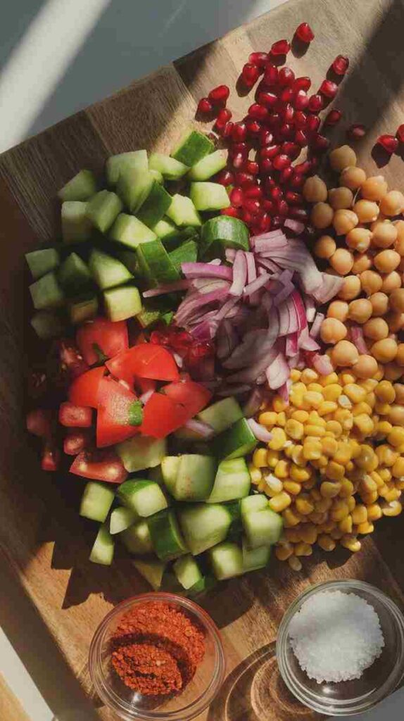 While the chickpeas and corn cool, prepare your salad bowl. Add the chopped cucumber, tomato, onion, and pomegranate seeds to a large bowl. Toss them gently just to combine — no dressing yet, and no heavy mixing that would crush the delicate pomegranate seeds.
