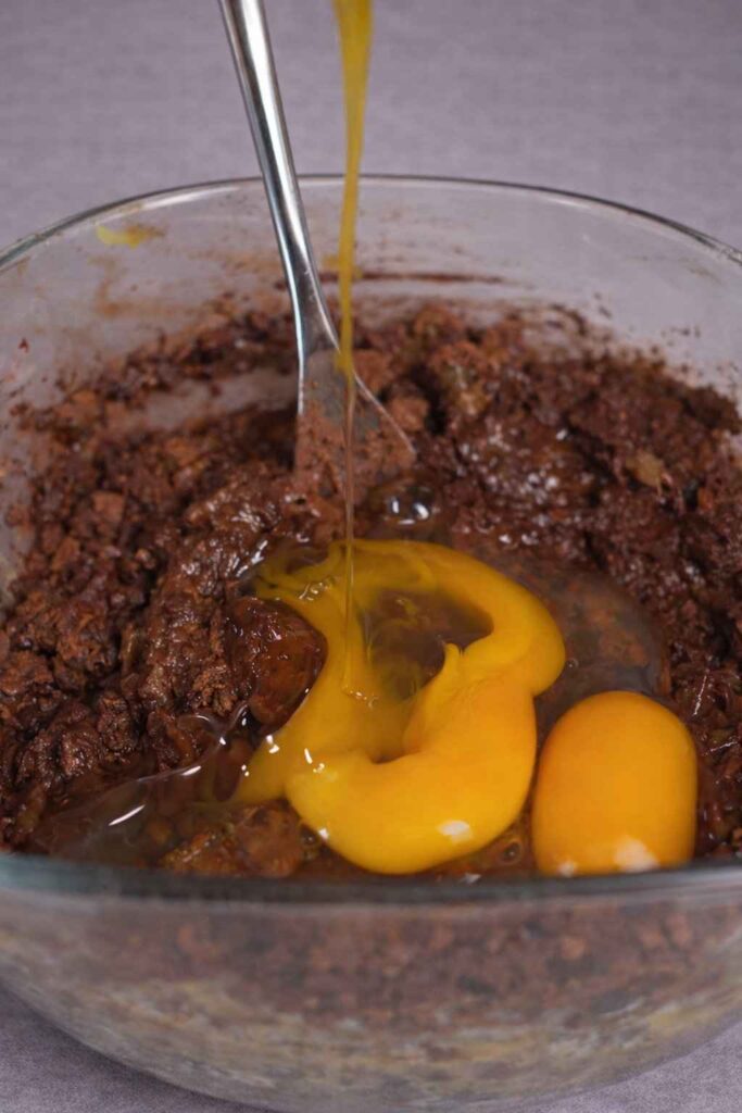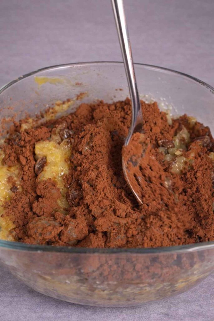 2. Add Wet Ingredients: Crack two eggs into the bowl with the mashed bananas. Add the cocoa powder and whisk everything together until well combined.