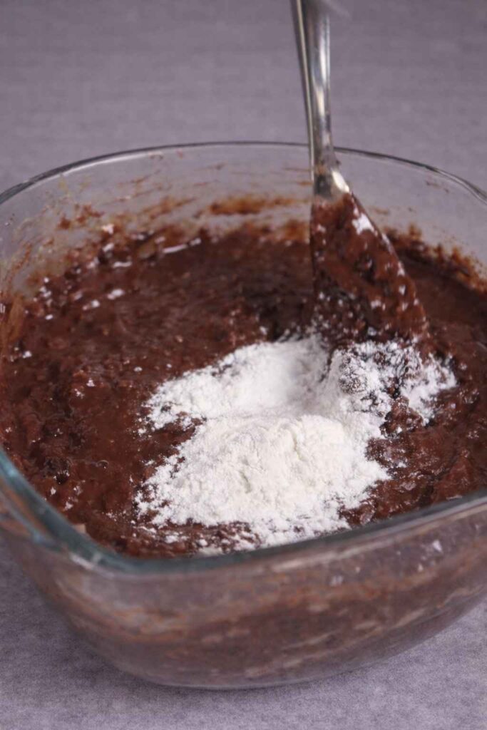 Whisk in eggs and cocoa powder until fully combined.