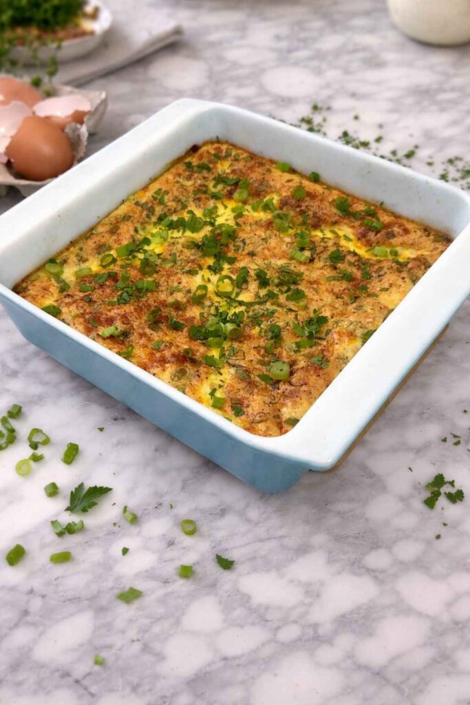 Remove the dish from the oven and allow it to cool for at least 5 minutes before slicing โ this resting time helps the bake firm up and makes it much easier to cut into clean squares. Top with freshly chopped parsley and additional sliced green onions for a pop of color and freshness. Slice into 6 equal portions and serve warm.