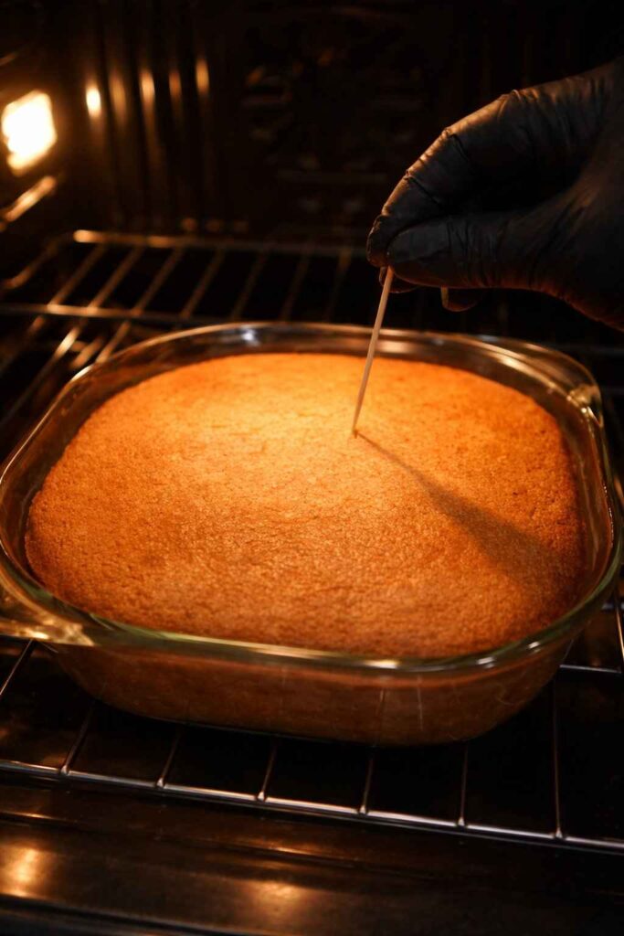 Insert a toothpick into the center — it should come out clean or with a few moist crumbs.