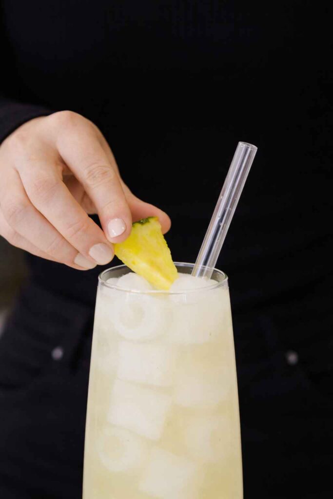 With the strained cocktail base sitting beautifully over fresh ice in the chilled highball glass, take your chilled soda water and pour it slowly and carefully down the inside wall of the glass, exactly as you would pour Champagne into a cocktail. Pouring down the wall rather than directly into the center minimizes turbulence, preserves the soda water’s carbonation, and allows the fizz to rise gently through the cocktail rather than erupting violently. Pour all 45ml of soda water in a single steady stream, watching as the effervescence creates a lively cascade of fine bubbles rising through the golden amber liquid. Now take your long bar spoon and insert it to the bottom of the glass. Make one to two slow, deliberate full rotations to gently combine the soda water with the cocktail base without aggressively degassing the carbonation. The final cocktail should be visibly sparkling with active bubbles rising through the amber liquid. For the garnish, take your pineapple wedge and cut a small slit into the flesh from the inner edge, sliding it onto the rim of the highball glass so it sits at an attractive angle. Thread the cocktail cherry onto a small skewer or cocktail pick and rest it alongside the pineapple wedge. Step back, take a moment to appreciate the golden color, the rising bubbles, and the vibrant garnish, then serve immediately.