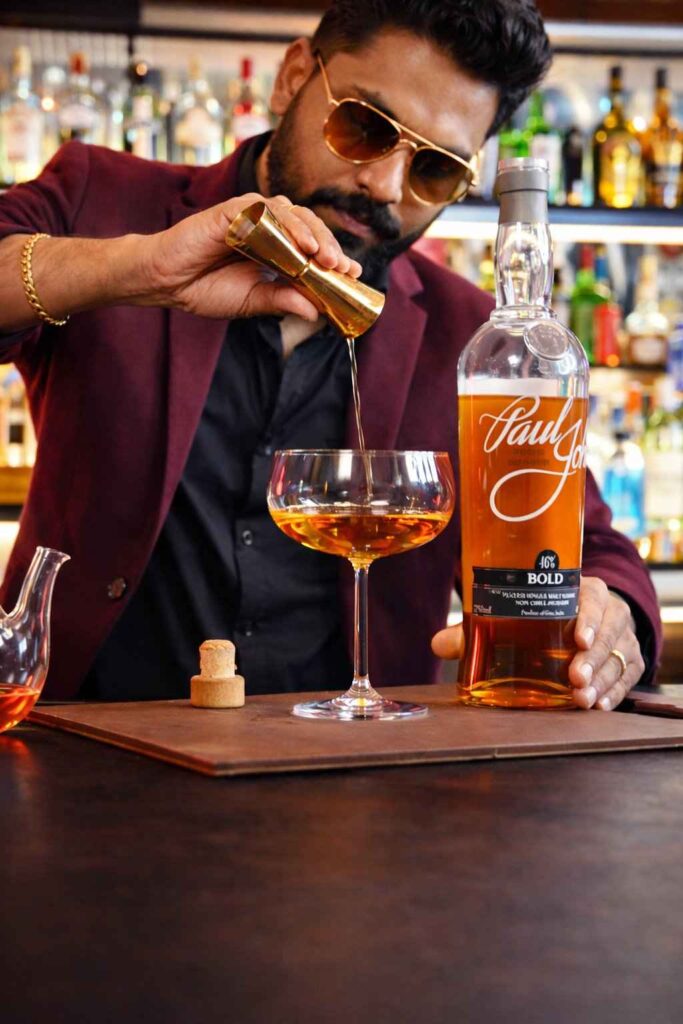 2. Add Whisky: Pour 60 ml of the single malt whisky you like into the glass. The video says to use Paul John Bold, but any single malt will do, with a smoky one being the best.