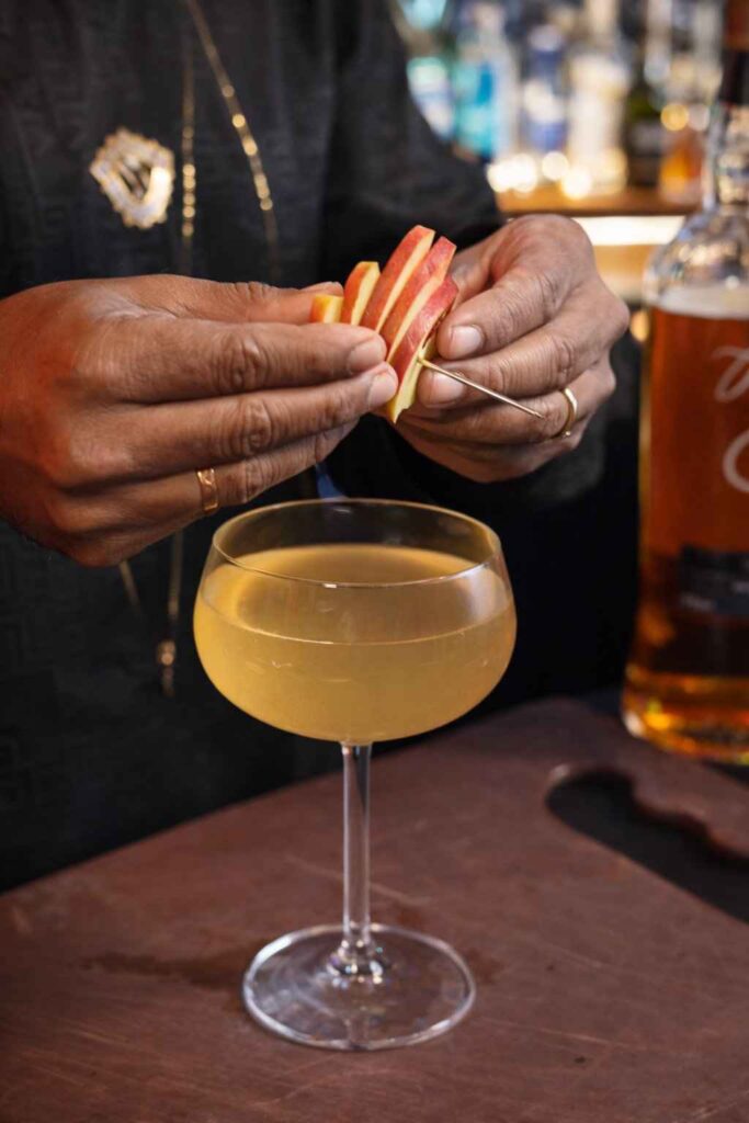 6. Garnish: Cut an apple into thin slices. Put a couple apple slices on the cocktail pin or toothpick and stick over the edge the glass or right on the drink.