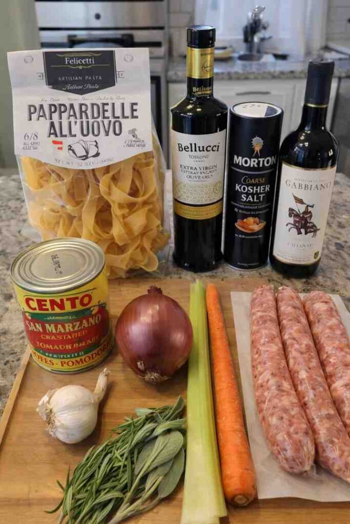 A classic soffritto of carrot, celery, onion, and garlic builds the aromatic base. Chianti deglazes the pan and adds a dry, wine-forward depth. Pureed San Marzano tomatoes bring a natural sweetness that balances the weight of the meat. Fresh sage and rosemary weave through every layer with their piney, herbal warmth. And wide ribbons of pappardelle catch and hold every bit of that sauce in the way that only a proper broad noodle can.