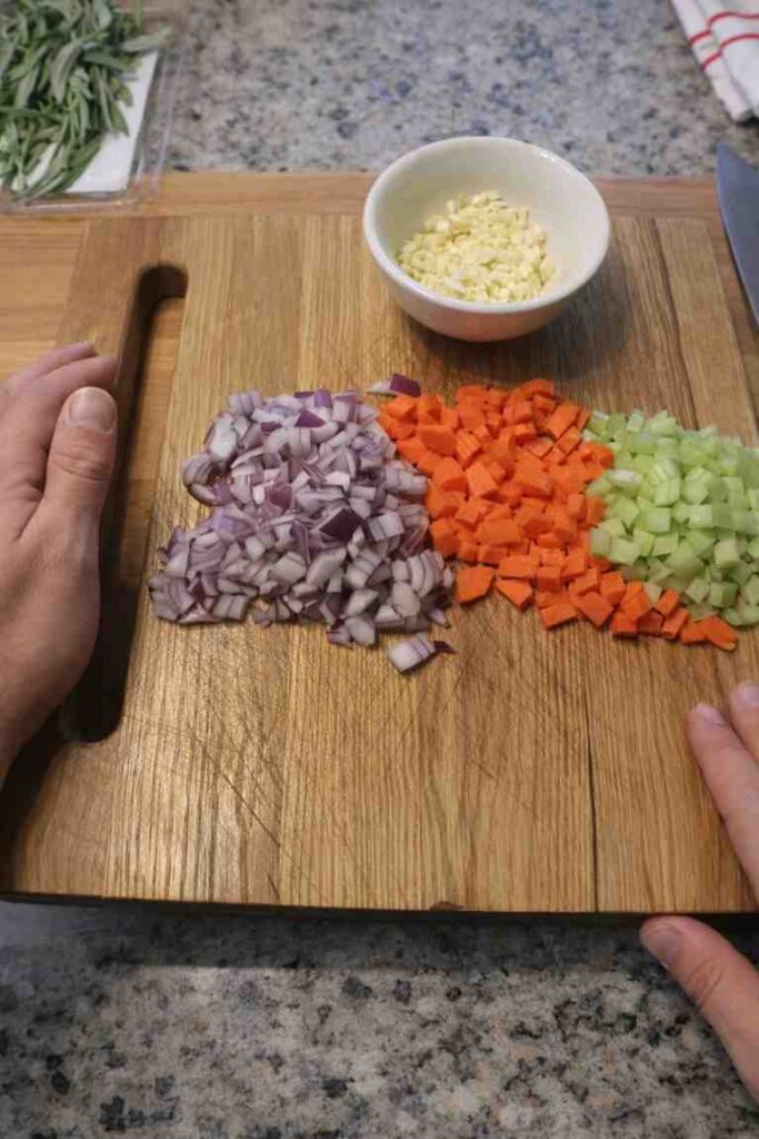 Add the finely chopped carrot, celery, and onion to the pan with the pancetta. Season with a pinch of salt and saute over medium heat for 8 to 10 minutes, stirring occasionally, until the vegetables are completely soft, fragrant, and the onion is translucent. Add the minced garlic and cook for another 1 to 2 minutes until fragrant.