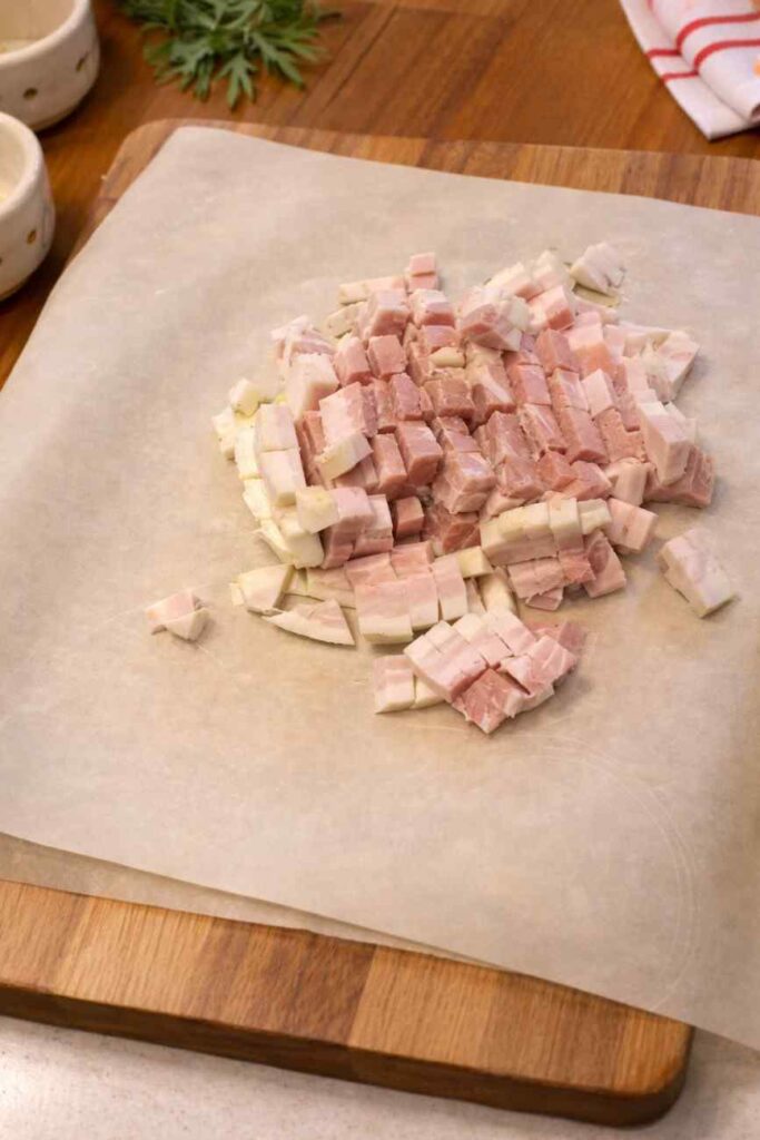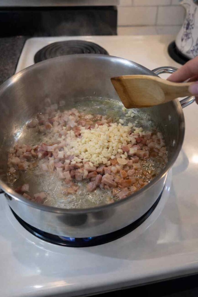 Do not rush this step and do not crank the heat. Slowly rendering the pancetta melts its fat into the pan rather than burning the outside while leaving the inside raw. That rendered pancetta fat is the foundation the soffritto and meat will cook in — it carries flavor through every subsequent layer of the sauce.