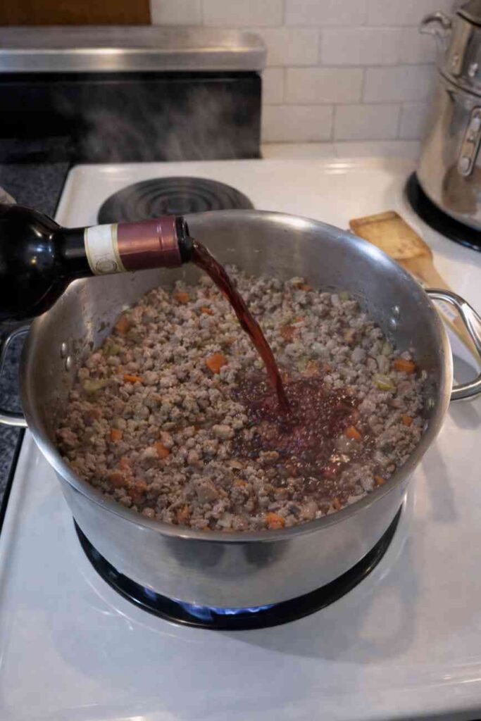 Allow the meat to develop real color — you are looking for deep brown on the pieces, not grey steaming. This browning (the Maillard reaction) creates hundreds of new flavor compounds that form the savory backbone of the entire ragu. Take your time at this stage and make sure most of the moisture has evaporated before moving forward. The pan should be fairly dry before the wine goes in.