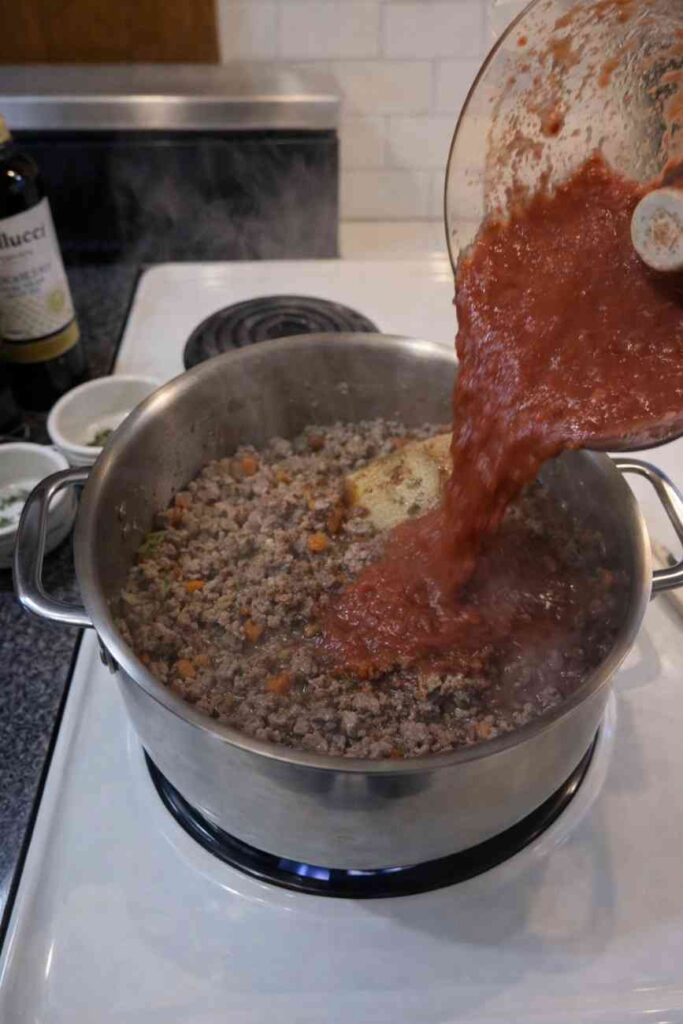 Pour in the pureed San Marzano tomatoes and stir well to combine everything evenly. Bring the ragu to a gentle boil, then reduce the heat to the lowest setting your stove allows and partially cover the pan.