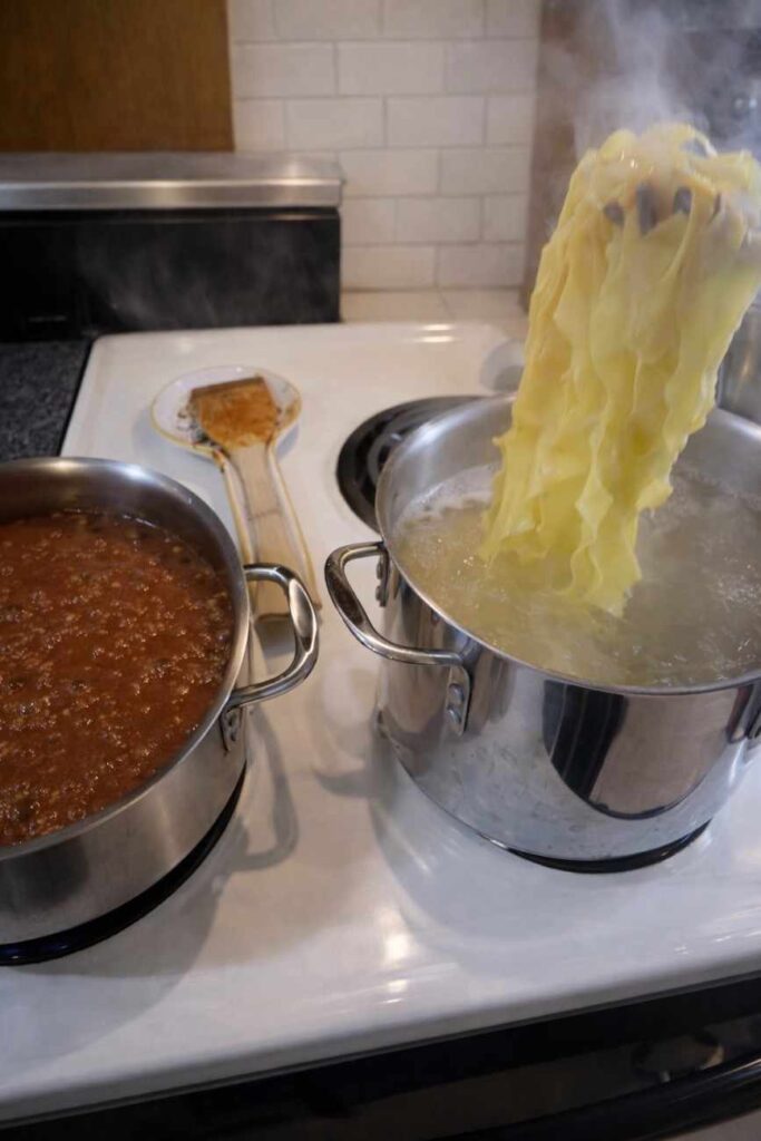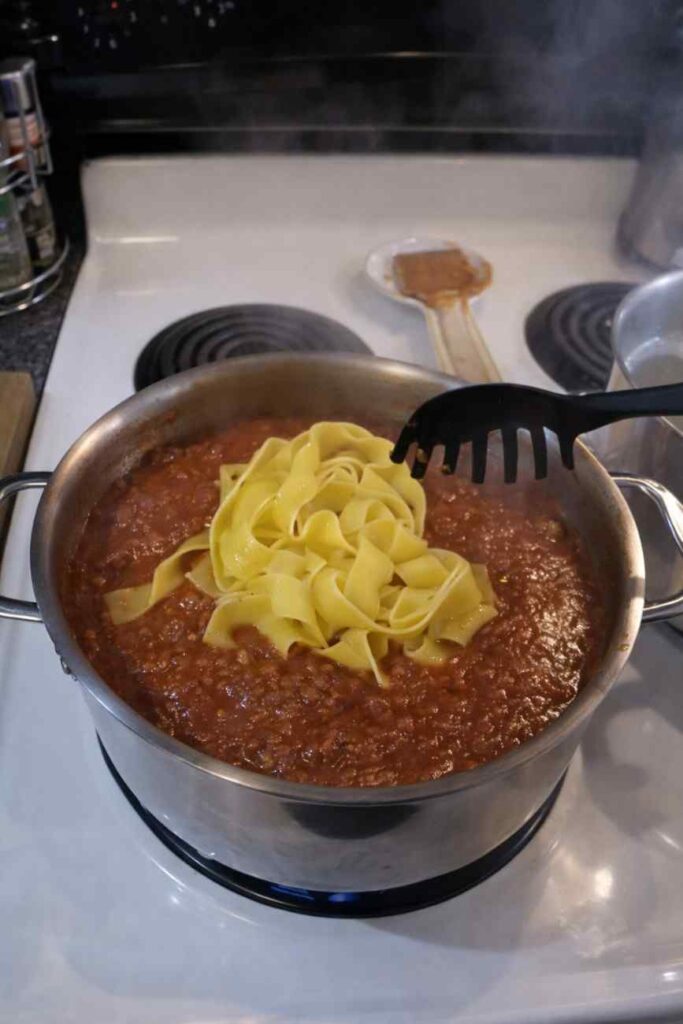 Transfer the pasta directly into the ragu pan using tongs, bringing some pasta water along with it naturally. Toss gently over low heat for 2 to 3 minutes, allowing the wide noodles to absorb the sauce and complete their cooking directly in the ragu. Add a splash of reserved pasta water if the sauce tightens too quickly.