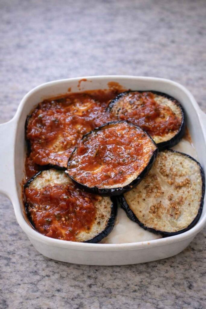 Select a baking dish of appropriate size — a standard rectangular casserole dish or a square baking dish works well. Begin layering with a thin, even spread of keto marinara sauce across the entire bottom of the dish. This base layer of sauce prevents the bottom eggplant layer from sticking to the dish and adds moisture that steams upward through the layers during baking.
