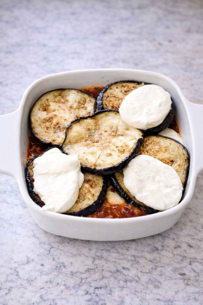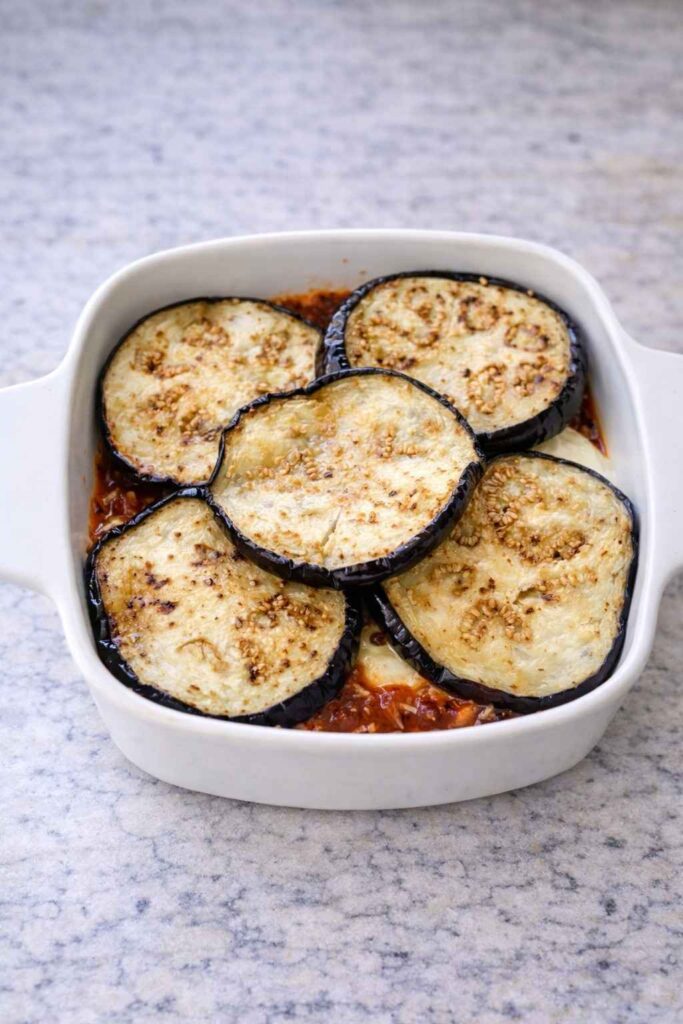 The layering order — sauce, Parmesan, eggplant, mozzarella, eggplant, sauce, Parmesan — is the classic structure, but it is a guideline rather than a rigid rule. If you have enough eggplant for three layers rather than two, simply repeat the sequence. The essential principles are that the bottom has sauce to prevent sticking, the mozzarella is embedded within the layers so it melts into the interior, and the final surface is Parmesan.