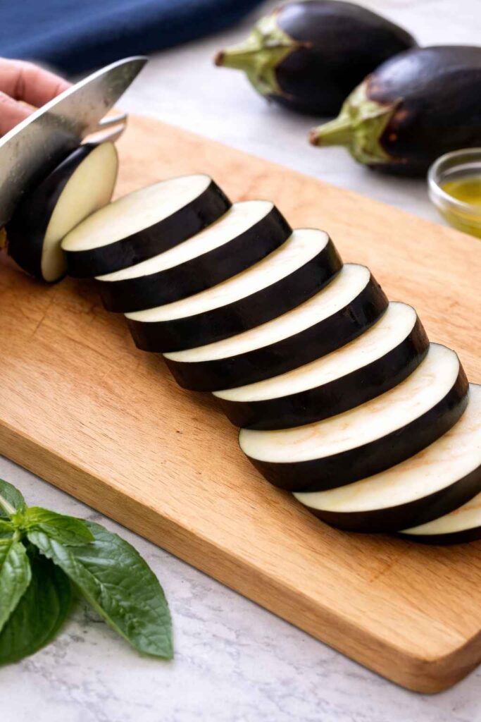 Begin by washing the eggplant and trimming the stem end. Slice it into thick, even rounds — aim for approximately 1 centimeter thickness. Slices that are too thin will disappear into the sauce during baking; slices that are too thick will take too long to cook through and may remain tough in the center. Even thickness across all slices is important so that every piece cooks at the same rate.