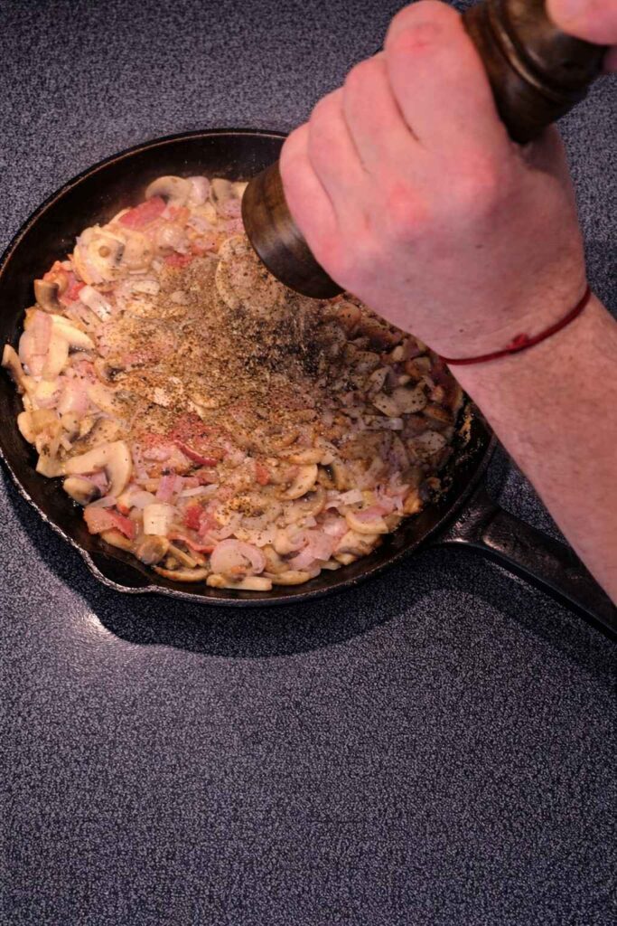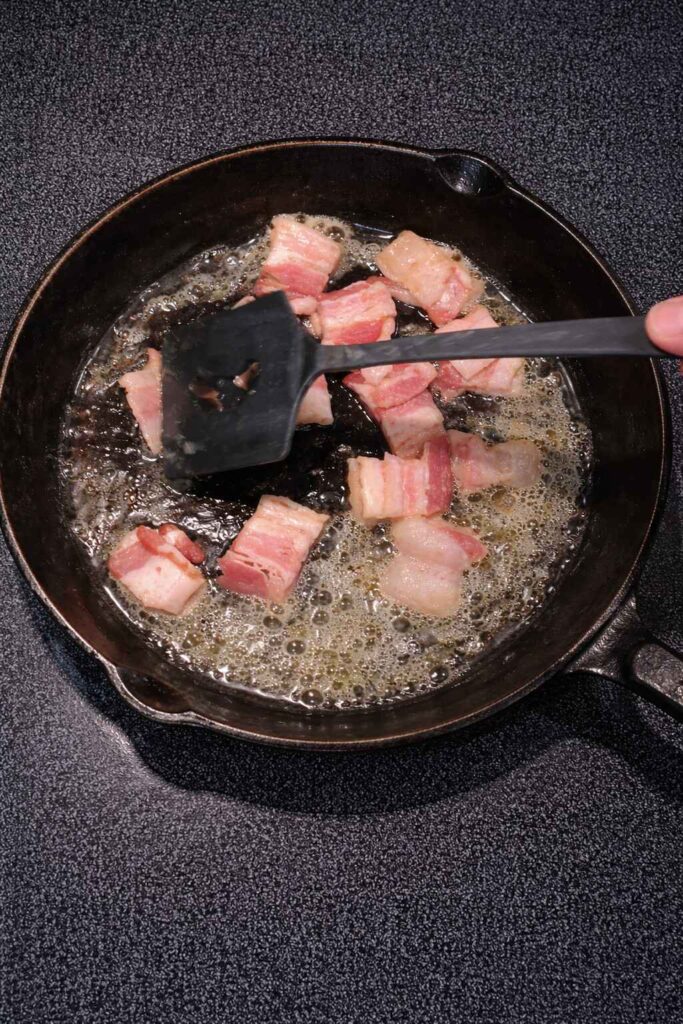 Fry bacon until crispy, remove. Sauté onion in drippings until soft.
