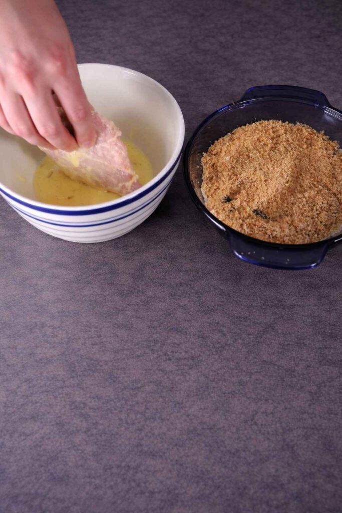 Dip pork in egg wash, then press into breading. Refrigerate 30–60 min for best adhesion.