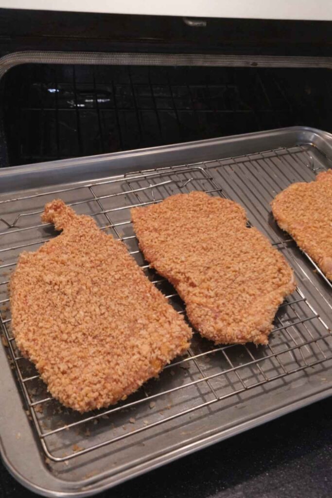 5. Chill for Optimal Adhesion: Arrange the breaded pork loins on a baking sheet and refrigerate for a minimum of 30 minutes, or for up to 1 hour. This essential phase ensures that the breading is securely attached to the meat, thereby preventing it from detaching during the frying process.