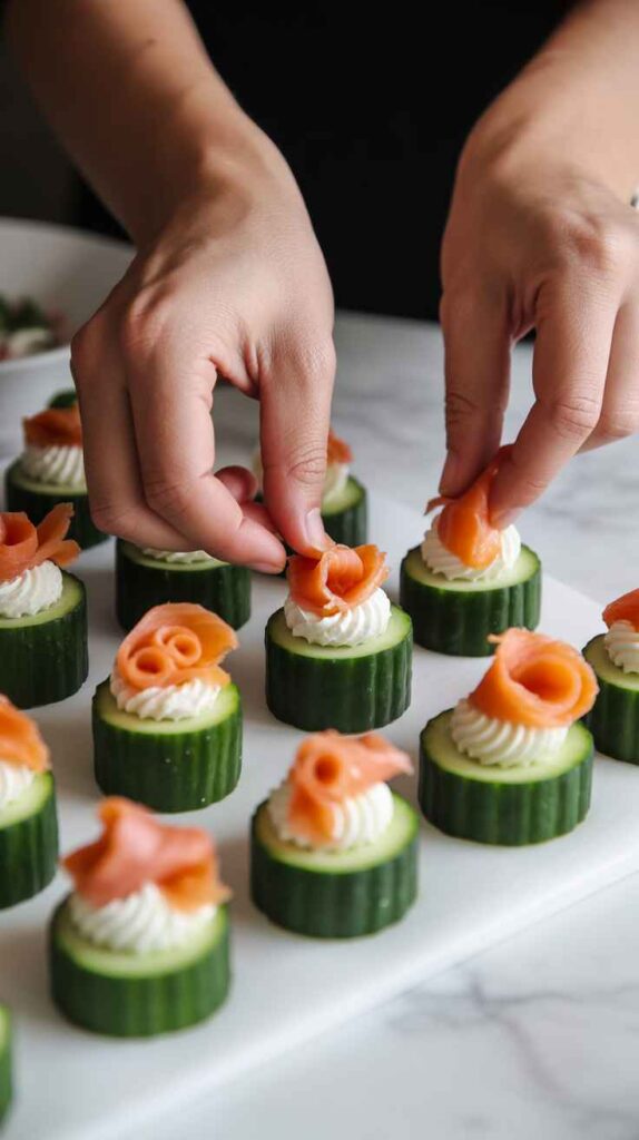 - Top with salmon: Cut smoked salmon into small ribbons or squares that fit the cucumber rounds.Gently fold or curl a piece onto each one for a little height.