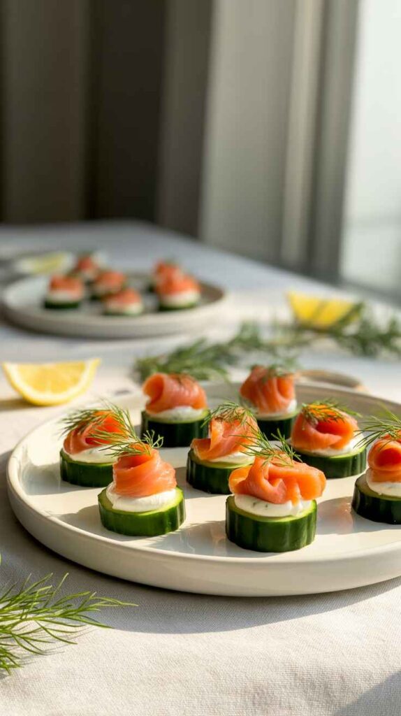 Crisp cucumber rounds topped with creamy herbs and smoky salmon