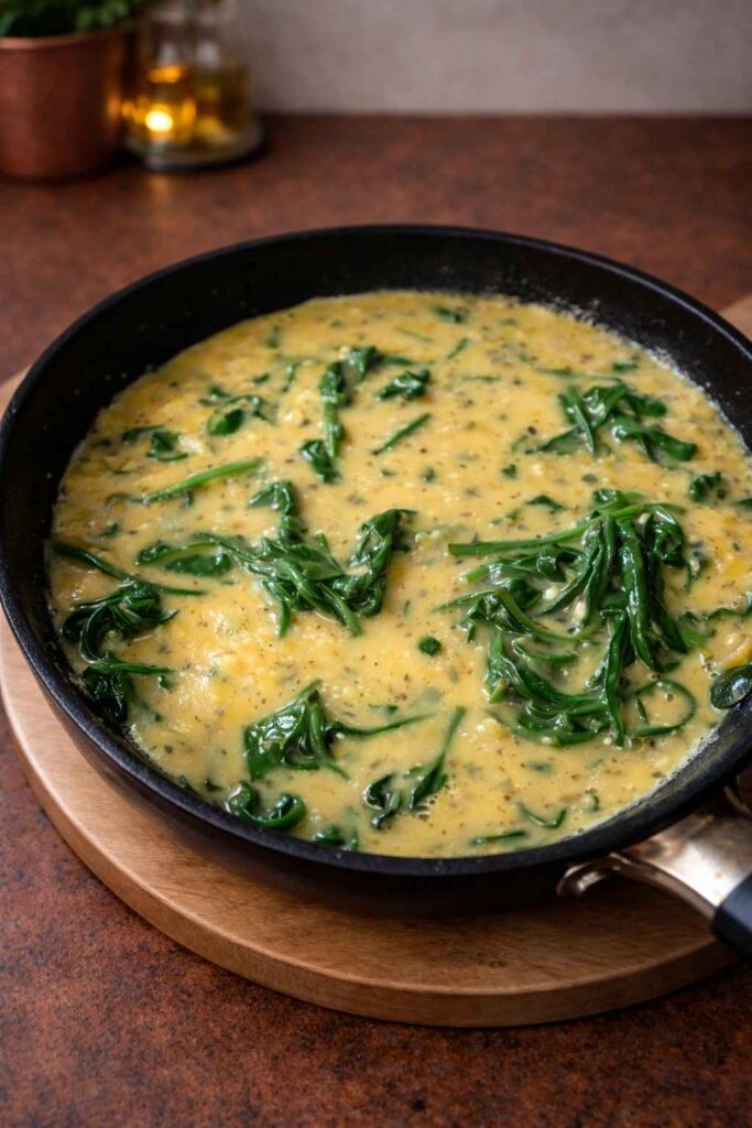 With the heat on low, pour your beaten egg and cream mixture directly over the wilted spinach in the pan. Gently move the spinach around with a spatula so that the egg can flow underneath it and reach the bottom of the pan evenly. From this point forward, resist the temptation to crank up the heat. Low and slow is the golden rule of omelet making. High heat will cook the bottom too fast, leaving the top raw, and it will produce a rubbery, tough texture rather than the silky, custard-like result you are after. Allow the eggs to cook gently and undisturbed on low heat until the edges begin to set and pull away from the sides of the pan.