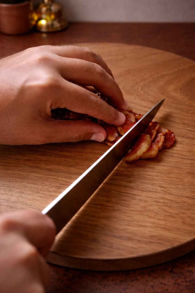 Place the bacon rashers into a cold, non-stick skillet and then turn the heat to medium-high. Starting the bacon in a cold pan allows the fat to render out slowly and evenly, which produces a crispier result than dropping bacon into an already-hot pan. Cook until the bacon reaches your desired level of crispiness — for this recipe, you want it genuinely crispy so that it adds a satisfying textural contrast to the soft, creamy eggs. Remove the bacon from the pan and set it on a paper towel-lined plate to drain. Once it has cooled slightly, roughly chop it into small bite-sized pieces and set aside. Crucially, leave the rendered bacon fat in the pan.