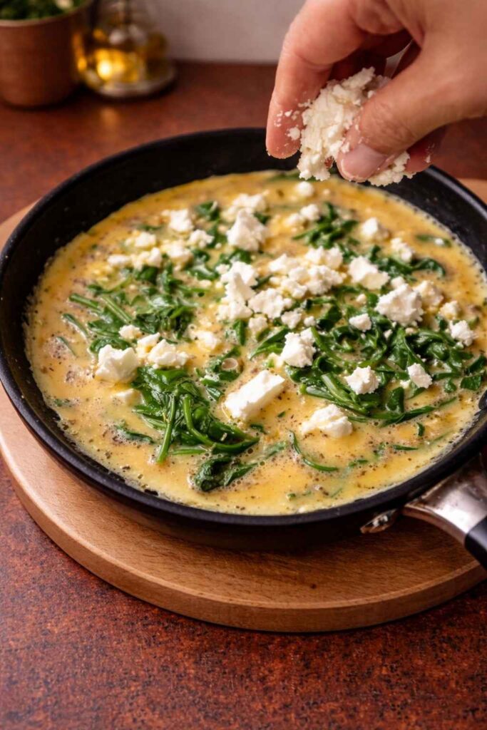 Cover the skillet with a lid and allow the omelet to cook on low heat for 3 to 4 minutes. This is the technique that sets this omelet apart from most. By covering the pan, you trap the steam rising from the eggs and spinach, which gently and evenly cooks the top of the omelet without requiring you to flip it. Flipping an omelet loaded with toppings is a reliable way to end up with a messy scramble rather than an elegant finished dish. The steam method keeps the top set perfectly and gives the feta cheese time to soften and become wonderfully creamy.