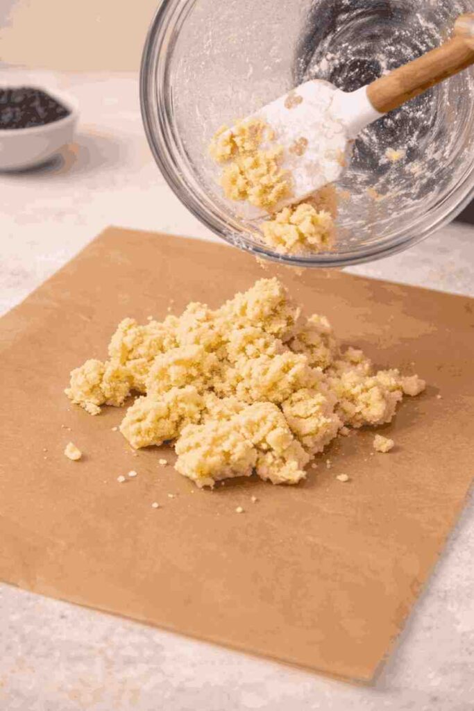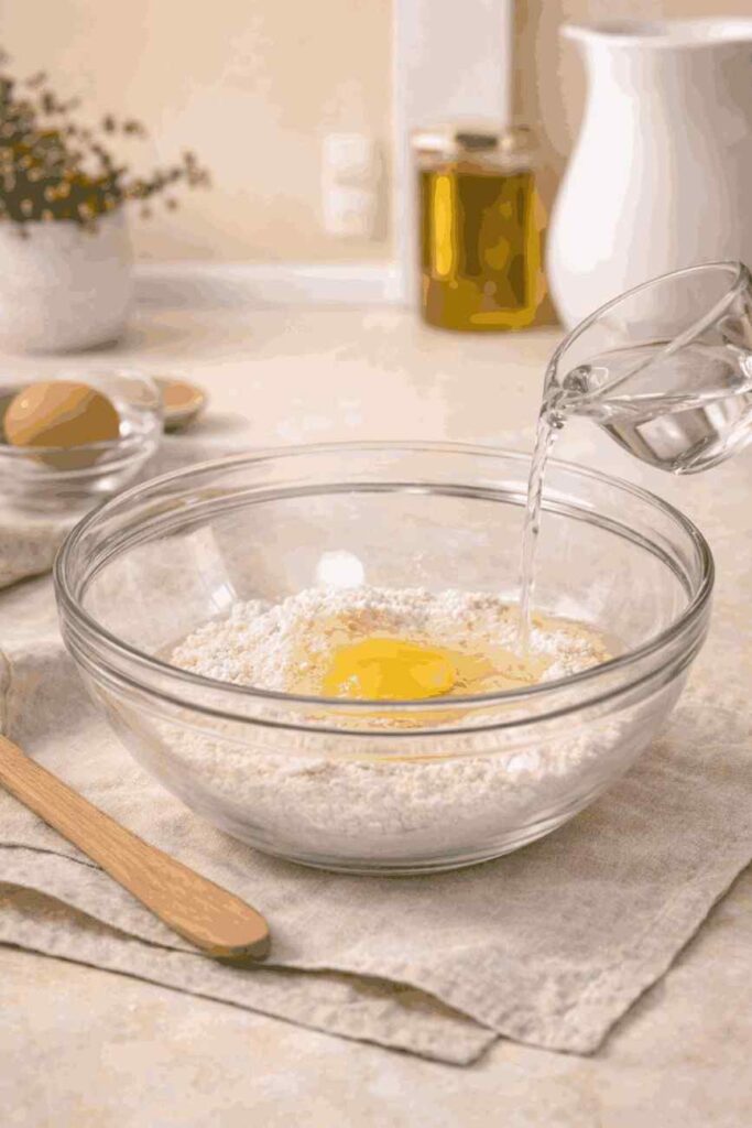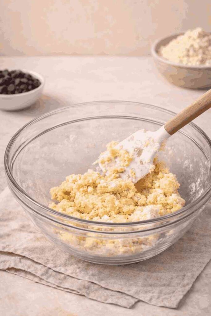 Add the room-temperature egg and one tablespoon of water to your dry mixture. Use a spatula to fold everything together until combined. The dough will look slightly crumbly at this stage — that is completely normal. Add the second tablespoon of water only if the dough feels too dry to hold together.
