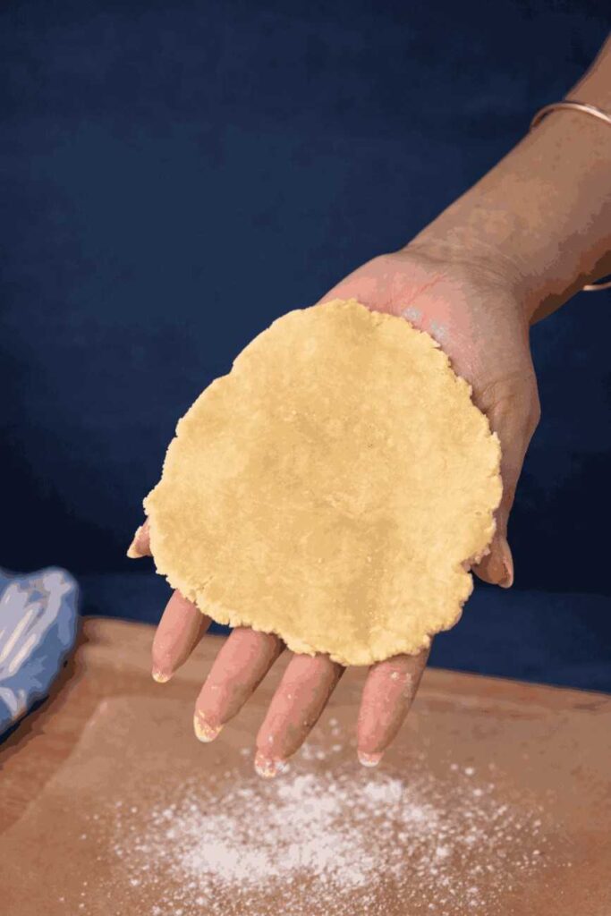 Place one dough ball between two sheets of parchment paper. If you have a tortilla press, press firmly to flatten it to the size of a traditional corn tortilla. No tortilla press? No problem. A heavy skillet, a flat-bottomed pan, or a rolling pin works just as well. Aim for an even thickness — not too thin that it tears, and not too thick that it stays dense.