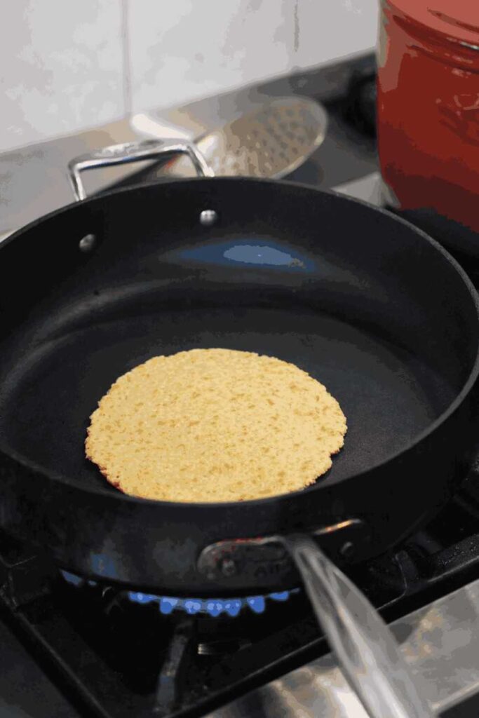 Heat a non-stick skillet or cast-iron griddle over medium-low heat. No oil is necessary. Carefully peel the pressed tortilla off the parchment and lay it flat on the hot surface. Cook for 1–2 minutes until small golden-brown spots appear on the bottom, then flip and cook for another 1 minute on the other side. The tortilla should remain soft and flexible when done — not crispy.