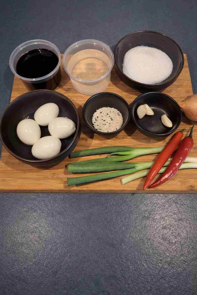 You will need 350 mL of soy sauce, 350 mL of Dashi or water (1:1 ratio), 100g of sugar, one small onion, around three cloves of garlic, about a tablespoon of sesame seeds, two green onions, two chilies (or other hot pepper), and as many soft-boiled eggs as you want.