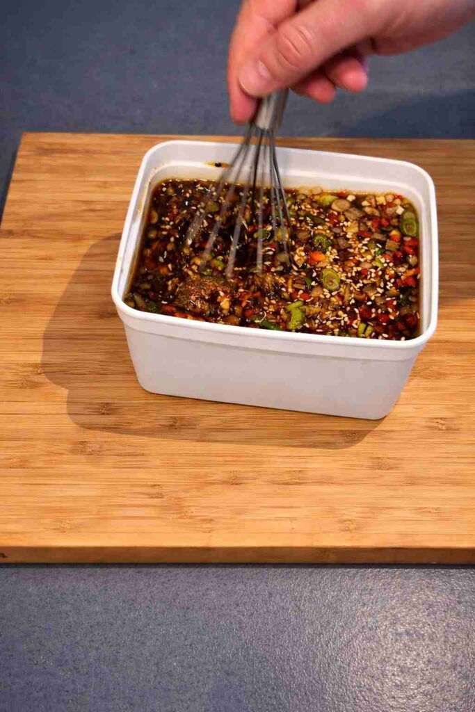 - Make the Marinade:Put all of the marinade ingredients in a medium-sized mixing bowl. These are: 2 tablespoons of finely chopped onion, 2 tablespoons of freshly sliced scallions, 1 tablespoon of minced garlic, 2 teaspoons of sugar, 2 tablespoons of bright chili flakes, 100 ml of water, and 75 ml of soy sauce. Make sure all the flavors are fully mixed by whisking everything together until the sugar is completely dissolved.
