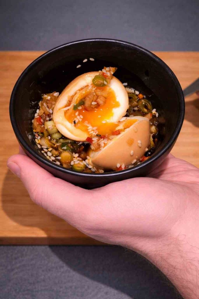 Good job! Your handmade Mayak Eggs are ready to eat now that the flavors have had a chance to mix overnight. The wait is worth it since you know how good they will taste and how exquisite their texture will be. What you’ll find is more than just a simple marinated egg. It’s a testament to how well Korean flavors work together. The savory depth of soy sauce, the delicate sweetness of sugar, the strong smell of garlic and onion, and the subtle warmth of chili flakes all come together in a tender egg with a delicious, slightly runny yolk. These eggs can easily make any meal better. Serve them with a warm bowl of freshly cooked rice so that the marinade may soak into the grains and provide flavor to every bite. They also create a great banchan (Korean side dish) that goes well with grilled meats, stews, or any other Korean food. Mayak Eggs are a great food that is high in protein and can fulfill your appetite with their delicious taste. If you keep them in an airtight container in the fridge, they usually last for a few days, which makes them great for meal prep. Every bite gives you a taste of the cozy and lively world of Korean food, and the taste stays with you, making it genuinely “addictive.” Accept the dish’s simple and deep flavor, and make it a favorite in your kitchen.