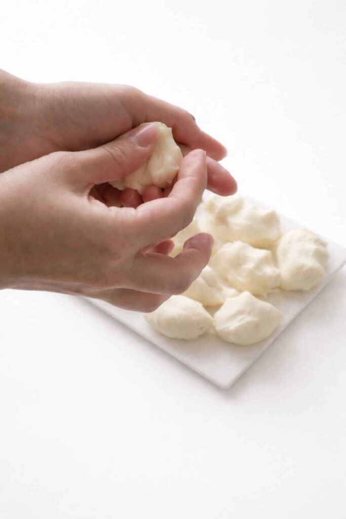 Divide the rested dough into equal portions. Depending on the size of cheese cube you’re using, each dough portion should be roughly the size of a large marble or a small walnut β about 20 to 25 grams per piece. Consistency in sizing is important for even frying. Uneven sizes mean some balls will be perfectly golden when others are either underdone or overdone.