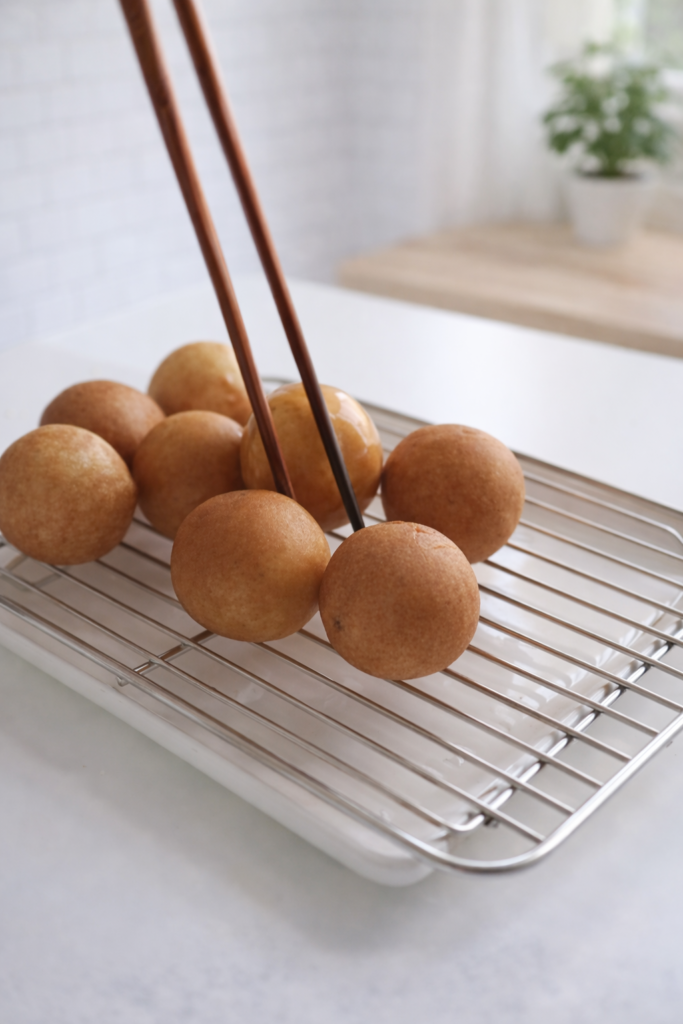 Gently lower the cheese balls into the oil β work in batches of 4 to 5 at most, never crowding the pot. As soon as the balls are in the oil, begin rolling them constantly using a slotted spoon or chopsticks. This continuous rolling is the signature technique of Korean cheese ball frying, and it serves two essential purposes: it ensures even, uniform browning on all sides, and it maintains the round shape of the balls as the dough sets. A ball left sitting on one side against the bottom of the pot will develop a flat spot and cook unevenly.