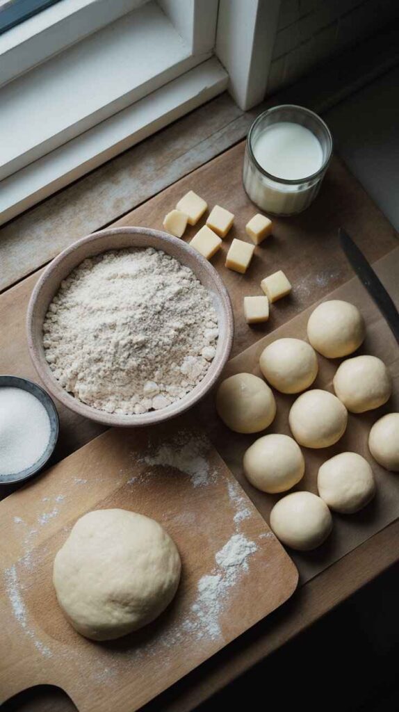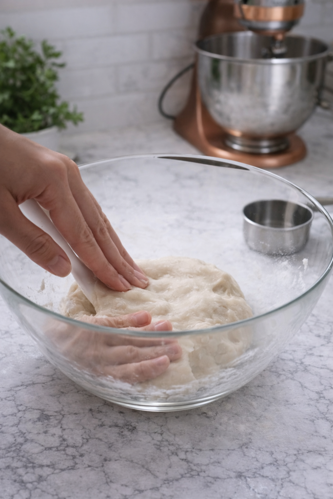At this stage, add the tablespoon of room-temperature unsalted butter. Now switch from the spatula to your hands. Knead the butter into the warm dough by pressing, folding, and working it repeatedly. The butter will feel like it’s not incorporating at first β it will seem slippery and separate. Keep kneading. After 2 to 3 minutes of steady hand-kneading, the butter will fully incorporate and the dough will transform into something smooth, slightly shiny, and pliable. It should feel soft and slightly tacky but not sticky enough to leave residue on clean dry hands.