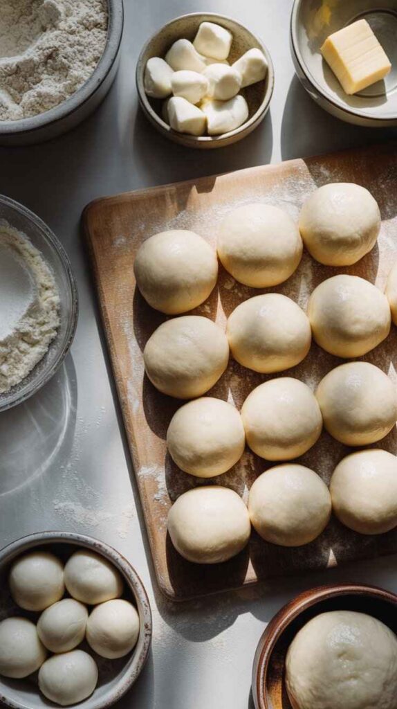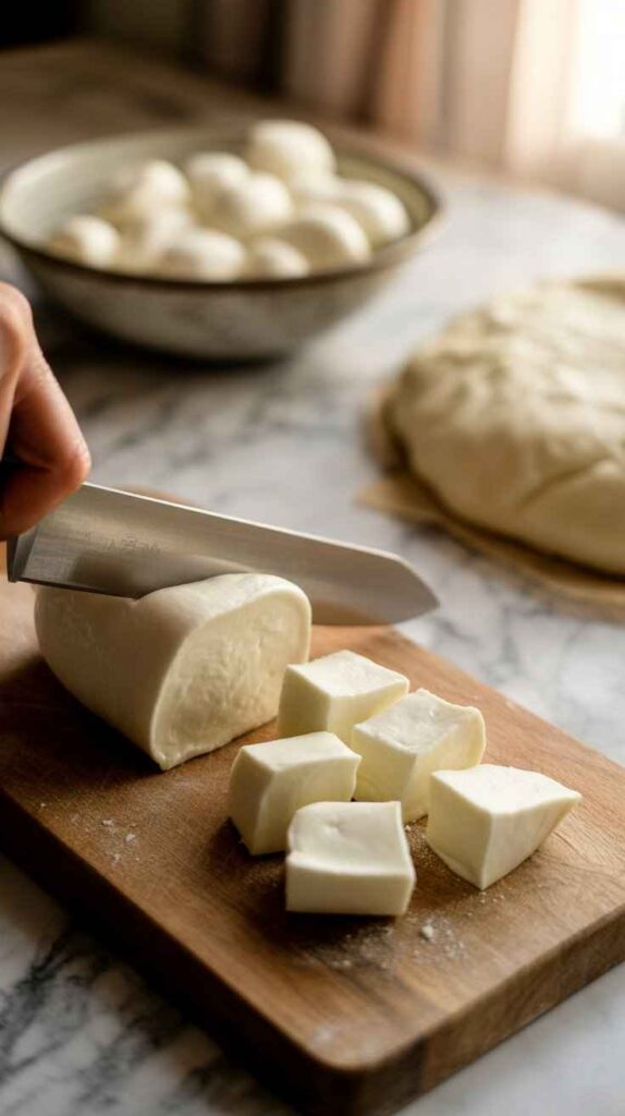 While the dough is resting, prepare your mozzarella. Cut your block mozzarella into cubes of approximately 2 cm β roughly the size of a large sugar cube. You want each piece to be substantial enough to provide a generous cheese pull when the ball is bitten into, but not so large that it overwhelms the dough and causes the ball to burst during frying.