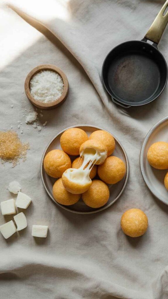 Korean cheese balls β sometimes called cheese bread balls or just cheese balls in Korean street food culture β became a viral sensation for very good reason. They are visually dramatic, texturally extraordinary, and flavored in a way that hits every single pleasure point simultaneously. The dough is made primarily from glutinous rice flour, which is the same ingredient behind mochi, tteok, and countless other beloved East Asian confections. It gives the outer layer of the fried ball a chewiness that regular wheat dough simply cannot replicate β a satisfying, yielding resistance that makes every bite feel substantial and deeply satisfying.