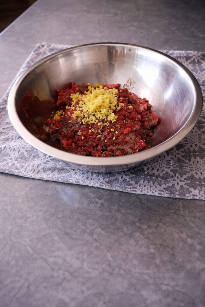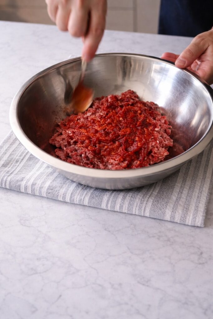 Place the ground beef in a large mixing bowl and allow it to sit at room temperature for 10 minutes if it has come directly from the refrigerator. Do not begin seasoning until you are ready to mix and immediately shape the meatballs — the timing here matters, specifically because of the fresh ginger’s proteolytic enzyme content (discussed in detail in Step 2). Spread the Gochujang, soy sauce, salt, and black pepper evenly across the surface of the ground beef rather than dropping them in a concentrated pile — even distribution of seasonings before mixing means less mixing required to achieve uniform seasoning, and less mixing means a more tender, more open-textured finished meatball. The protein in ground beef, when mixed aggressively, forms tight myosin cross-links that produce a dense, rubbery, unpleasant texture — exactly the opposite of the tender, yielding, juicy meatball this recipe is designed to deliver.