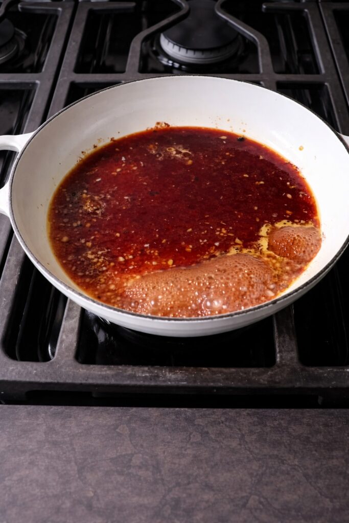 Allow the sauce to simmer actively, stirring occasionally, until it has reduced by approximately one-third of its original volume — a process that typically takes 4 to 6 minutes at a vigorous simmer. This reduction concentrates the sugar and soy compounds, intensifying the glaze’s sweetness and depth, and increases its natural viscosity through the concentration of dissolved sugars. Once reduced, prepare the cornstarch slurry by whisking the 2 teaspoons of cornstarch with the tablespoon of cold water in a small bowl until completely smooth and lump-free. With the sauce at a steady simmer, pour the slurry into the pan in a thin, steady stream while whisking continuously. Within 30 to 60 seconds of the slurry’s incorporation, the sauce will undergo a dramatic visible thickening — the gelatinized starch granules creating a glossy, coating, lacquer-like consistency that clings to a spoon rather than dripping from it. This is the visual signal that the glaze is ready.
