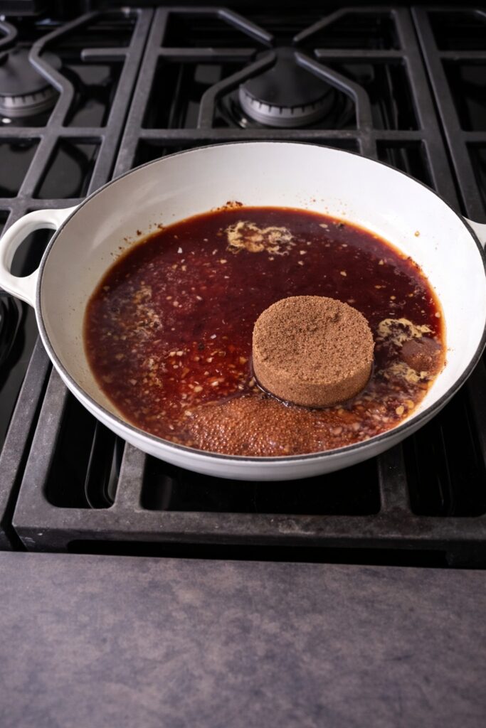 Rice vinegar (pH approximately 3.0–3.5, acetic acid content 4–5%) is the mildest of the commonly available vinegars — significantly less acidic than white wine vinegar (6% acetic acid), red wine vinegar (6–7%), and apple cider vinegar (5–6%). In this glaze, it performs three functions. First, acidity balance: it provides the sour element that counterbalances the brown sugar’s sweetness and the soy’s salt without the more aggressive tartness of Western vinegars. Second, fond dissolution: its mild acidity is sufficient to hydrolyze the pan’s fond during deglazing without introducing the sharp, harsh acidity that a stronger vinegar would. Third, flavor compatibility: rice vinegar’s clean, lightly fermented character has no competing flavor dimension — it supports the soy, sesame, and Gochujang without introducing a vinegar-forward note that would be inconsistent with Korean BBQ’s flavor expectations.