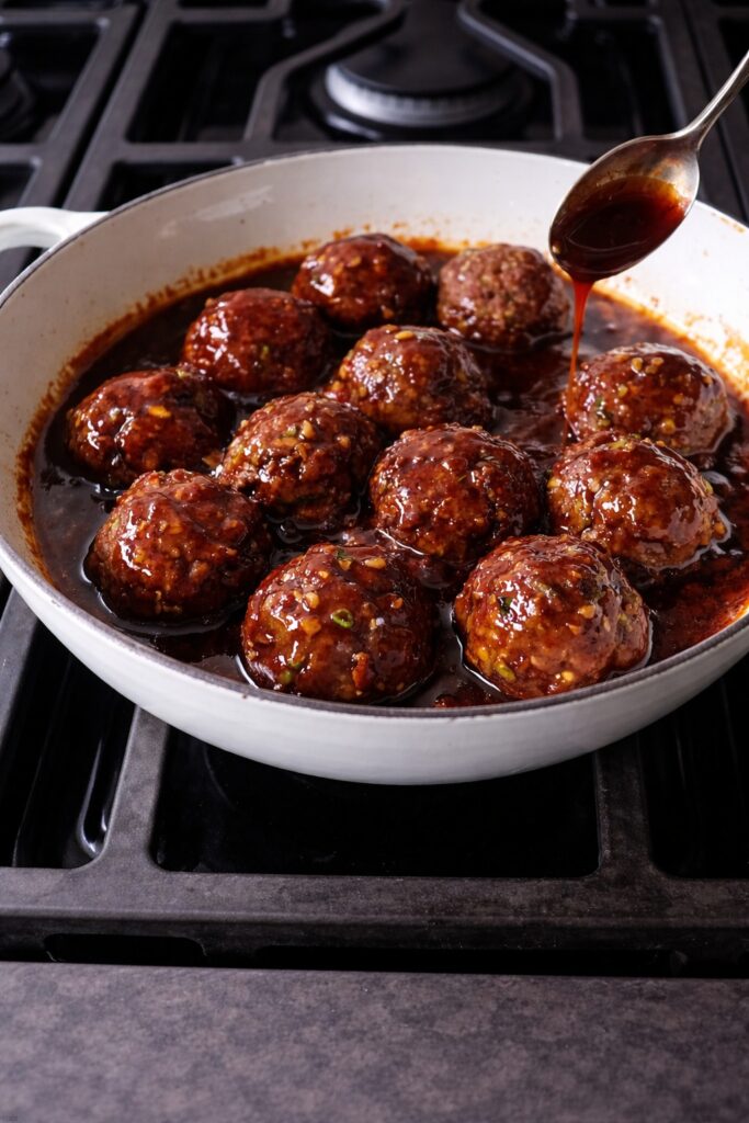 Return the meatballs to the pan and baste them generously and repeatedly, turning them in the sauce to coat every surface multiple times. The sauce should cling to each meatball in a visible, shiny layer — if it seems too thick to coat evenly, add a small splash of water and stir to loosen it back to glaze consistency. Heat through for 2 to 3 minutes until the meatballs are warmed through at their centers and every surface is completely lacquered.