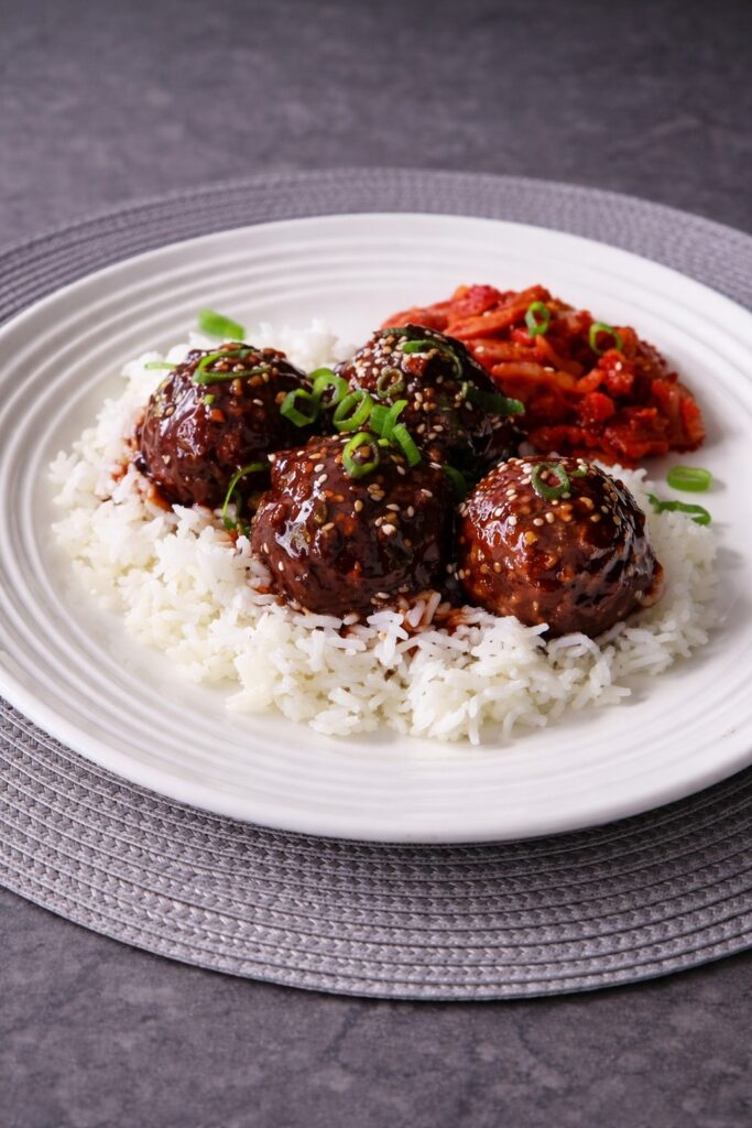 Short-grain rice (used for Japanese sushi rice, Korean steamed rice, and similar preparations) has a starch composition of approximately 20% amylose and 80% amylopectin — a high amylopectin content that makes cooked short-grain rice distinctly stickier and more cohesive than long-grain rice (which has approximately 23–26% amylose and a drier, more separate-grain texture). This stickiness is functionally important when eating with a sauce-heavy Korean BBQ preparation: the slightly sticky grains cling together and to the meatball surface, allowing the glaze to coat the combined rice-and-meatball bite rather than flowing off separate, loose rice grains. Short-grain rice also has a softer, more yielding cooked texture that contrasts appropriately with the meatball’s substantial chew without competing with it.