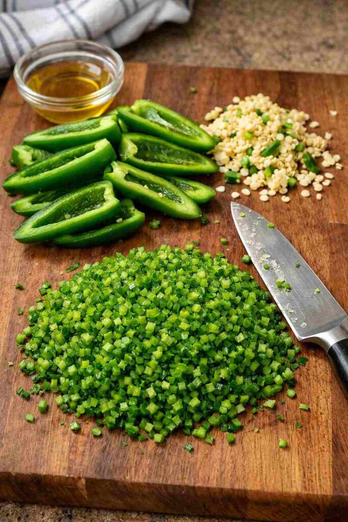 Begin by washing the fresh jalapeños under cold running water. Slice each pepper in half lengthwise and use a small spoon or the tip of your knife to scrape out the seeds and the white pith from inside. The seeds and pith contain the highest concentration of capsaicin, so removing them will produce a milder heat that is pleasant rather than overwhelming. Once the seeds are removed, mince the jalapeños as finely as you possibly can. The smaller the pieces, the more evenly they will distribute throughout the beef mixture, and the less likely the patties are to crack or fall apart during cooking. If you prefer a spicier burger, you can leave some or all of the seeds intact.