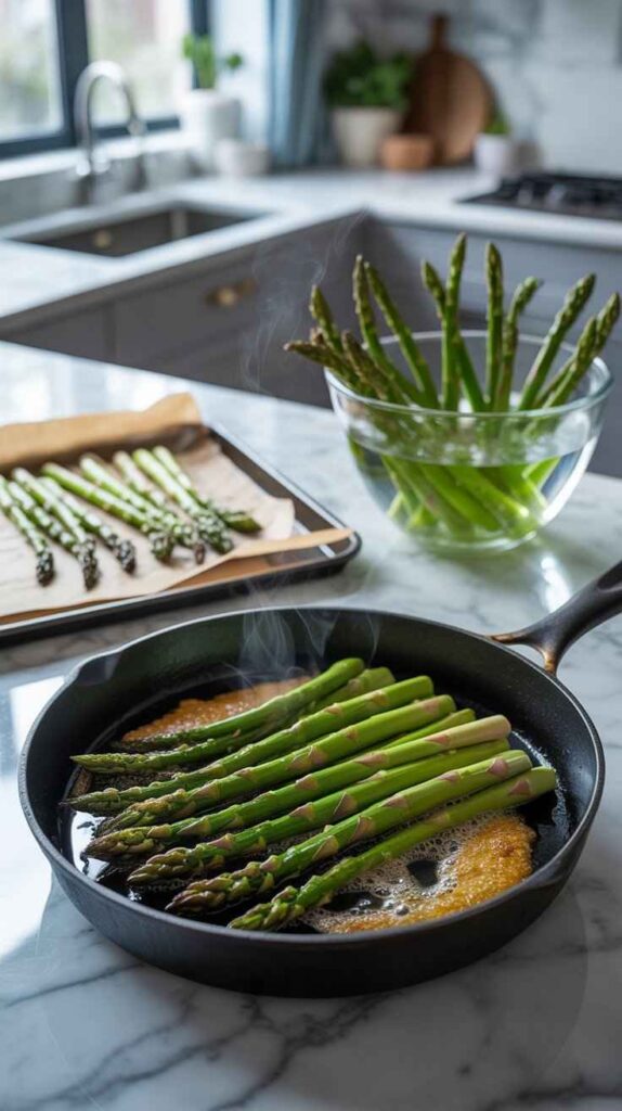 A wide, heavy-bottomed skillet — stainless steel or cast iron — is the best choice because its surface retains and distributes heat evenly, which promotes consistent browning rather than hot spots that cook some spears faster than others. The pan should be large enough to hold the asparagus in a single layer without overcrowding, as spears piled on top of each other will steam rather than sauté and will not develop any color or caramelization. A non-stick pan is a functional alternative but will not produce the same depth of browning or the flavorful fond — the caramelized bits on the bottom of the pan — that makes the garlic butter sauce in this recipe so good.
