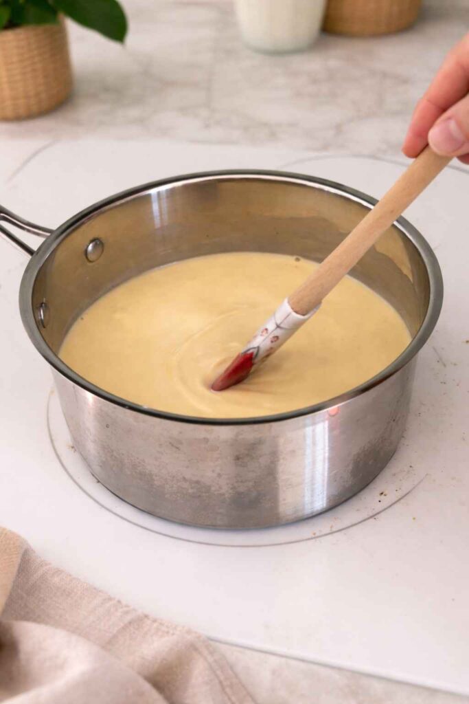 Next, pour the remaining 2¾ cups of eggnog into a medium saucepan over medium heat. Whisk in the cornstarch slurry and stir continuously for 5 to 7 minutes. You will notice the mixture thickening gradually. As soon as it reaches a thick, custard-like consistency — but before it comes to a full boil — remove it from the heat.