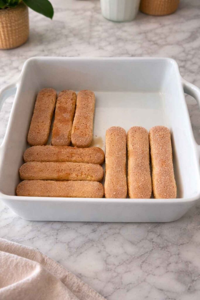 Once everything is cool, it is time to assemble. Take 12 ladyfingers and dip each one individually into the cooled coffee. Hold each biscuit in the liquid for just 1 to 2 seconds per side — no longer. You want the ladyfingers to absorb just enough coffee to be moist and flavorful without becoming completely saturated.