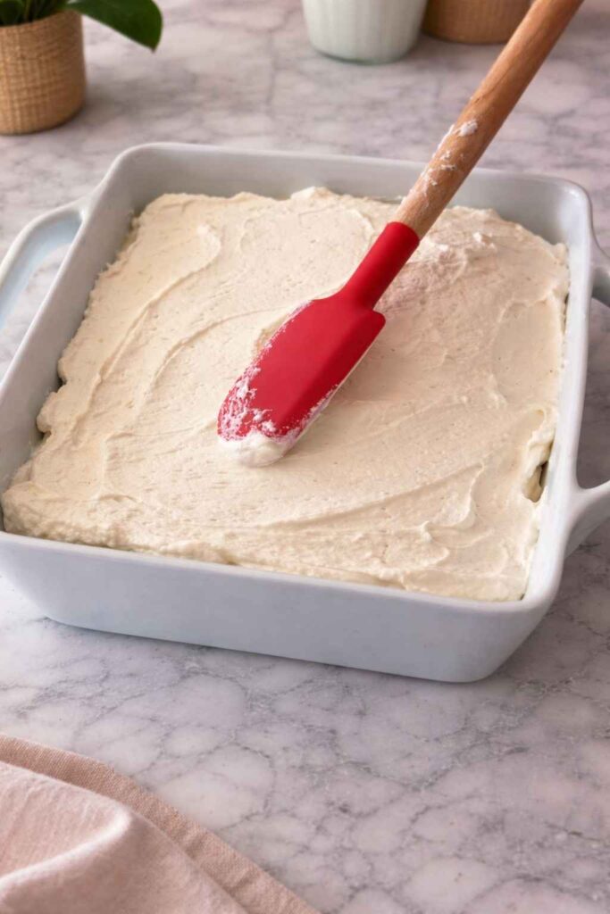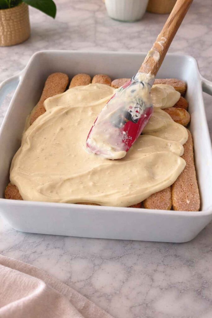 Repeat the process with the remaining 12 ladyfingers — dip, layer, and top with the rest of the eggnog custard. Spread the custard into an even, smooth layer. At this point, your tiramisu is already looking stunning.