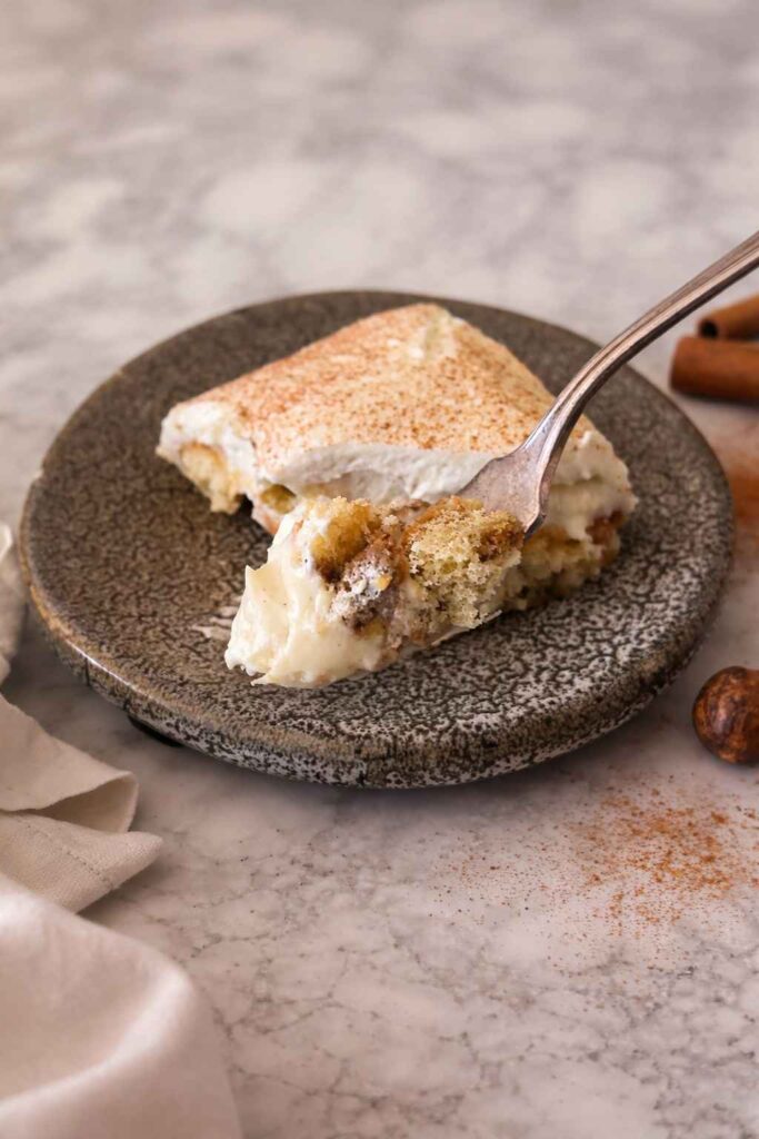 It captures the holidays in every bite. The combination of bold coffee, sweet creamy eggnog, and the warm spice of cinnamon is essentially the flavor of December. Every forkful tastes like the holidays.